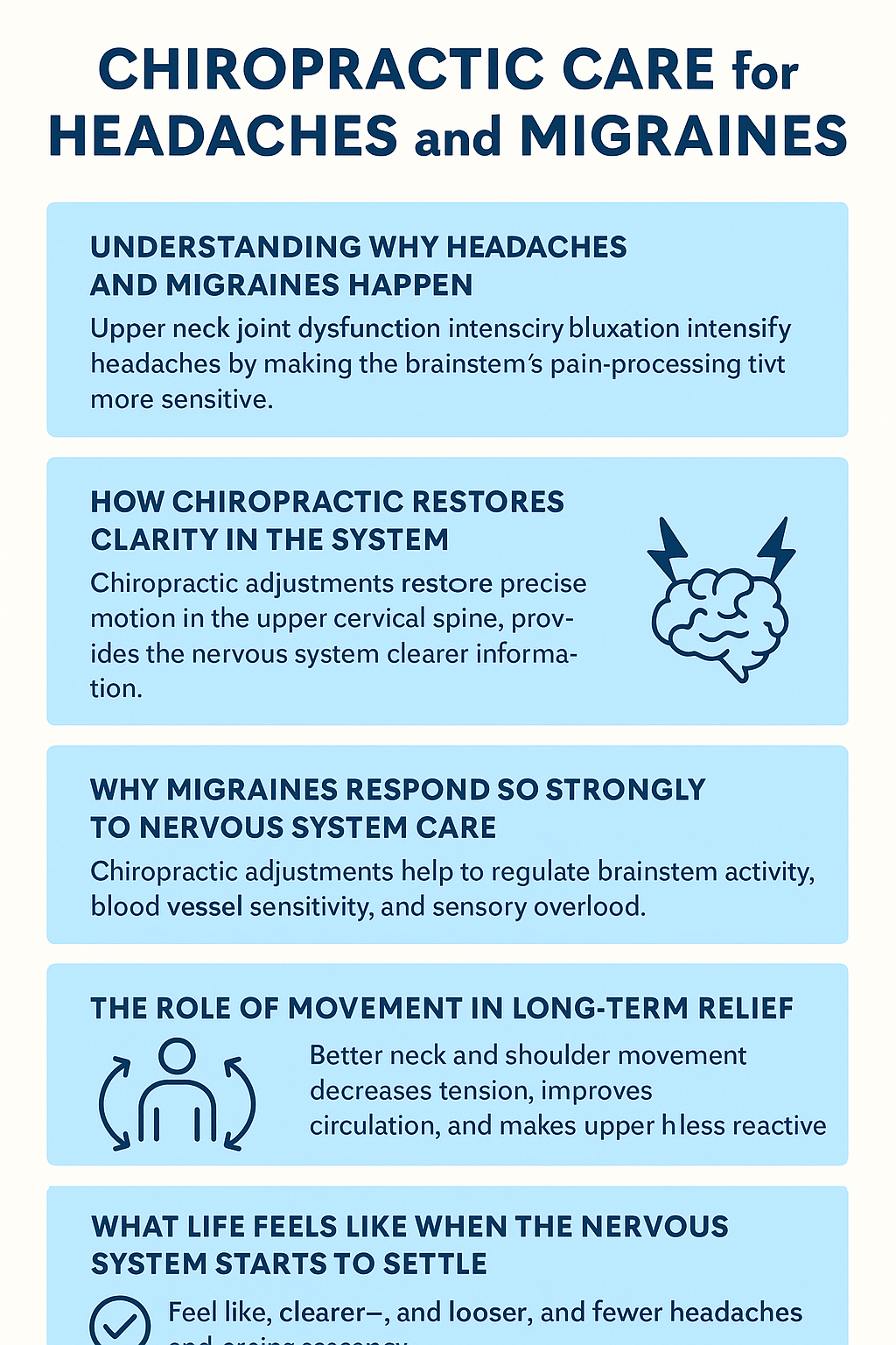 Chiropractic care works by improving the way the brain and body communicate. A chiropractic adjustment restores precise motion at specific spinal segments, particularly in the upper cervical spine where headaches often originate. When movement becomes clearer, the nervous system receives more accurate sensory information, and in response, muscle tone decreases, posture improves naturally and the body shifts out of protective mode.