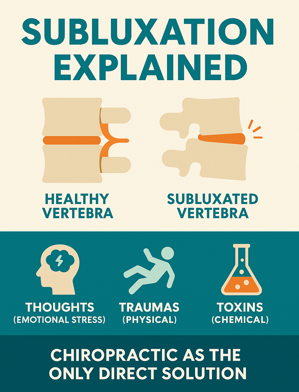 The word “subluxation” comes from Latin: sub meaning “less than” and luxation meaning “dislocation.” In chiropractic, we’re not talking about full dislocations — we’re talking about subtle joint dysfunctions. These occur when the vertebrae in your spine lose their normal motion or position. They may not cause instant, sharp pain — but over time, they can quietly wreak havoc.