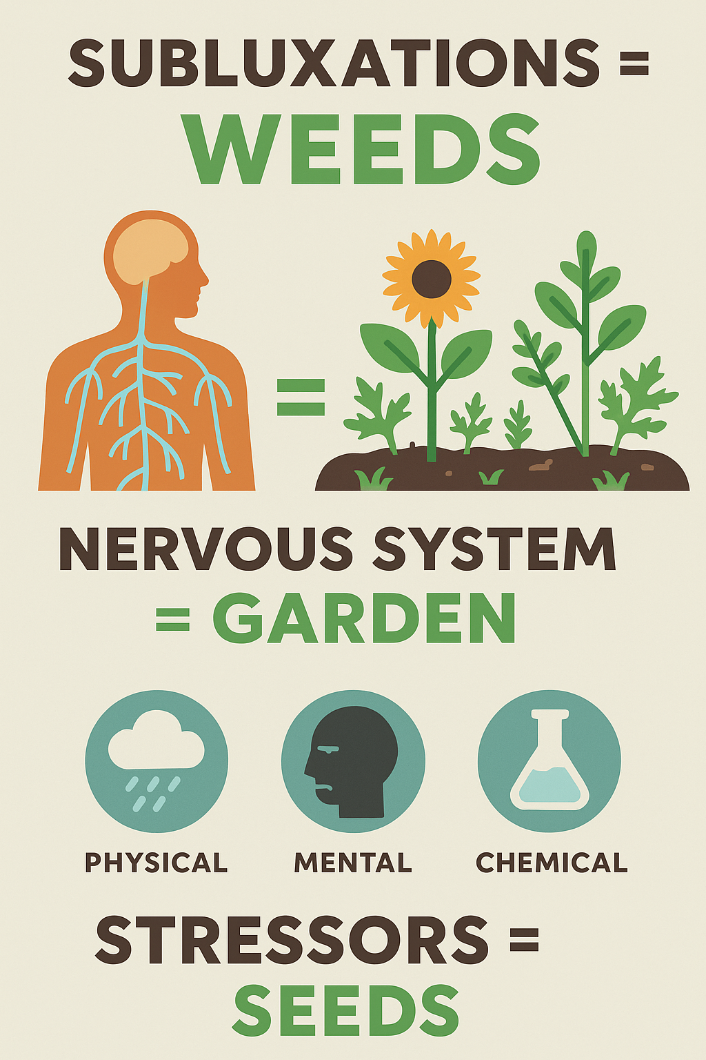 The truth is, stress is a part of life — the weeds will always try to grow back. But you have the choice to tend your garden consistently. With regular chiropractic care, you create the conditions for growth, health, and vitality, so your body can flourish like a well-kept garden.